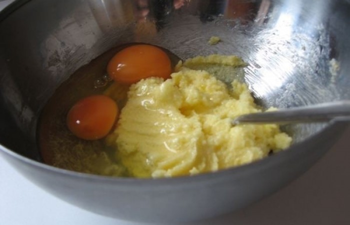3Добавляем сначала одно яйцо и тщательно перемешиваем. Затем - другое яйцо и опять перемешиваем.