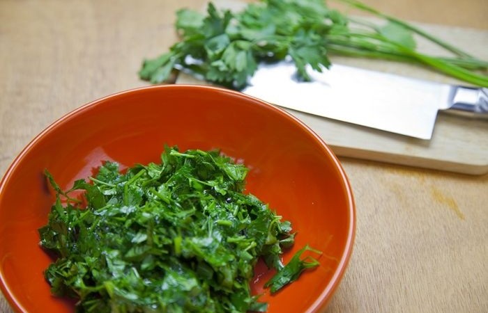 2Петрушку мелко нарубаем и смешиваем с белком. Солим, перчим и отправляем в холодильник на 15 минут.
