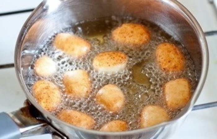 5Обжариваем пончики порционно в большом количестве раскаленного масла в течение 3-4 минут до румяности.