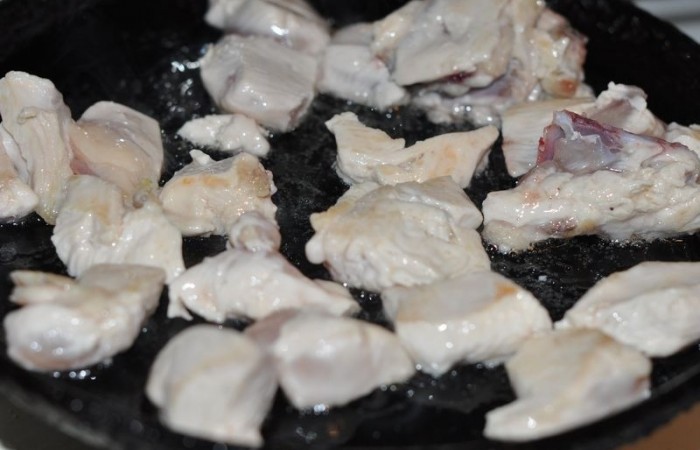 3Филе нарезаем небольшими кусочками и обжариваем в течение 5-7 минут. Солим, перчим по вкусу.