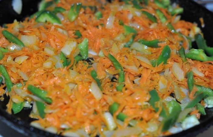 4Добавляем тертую морковь, нарезанный соломкой перец и измельченный лук и жарим еще 5-7 минут.