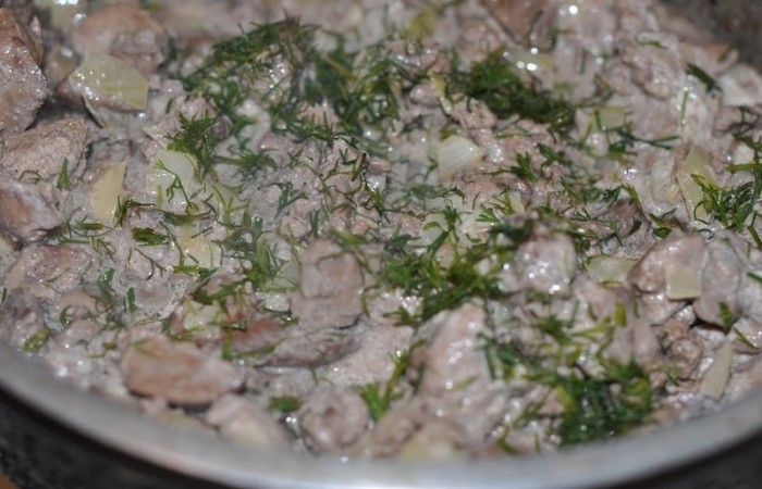 5Солим, перчим, добавляем рубленый укроп и сметану. Тушим под крышкой в течение 15 минут.