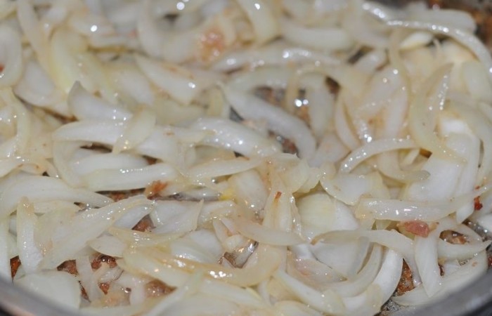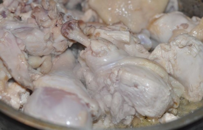 5Достаем курицу и перекладываем в толстостенную сковороду или казан, а в ту же сковороду кладем лук и жарим до золотистости.