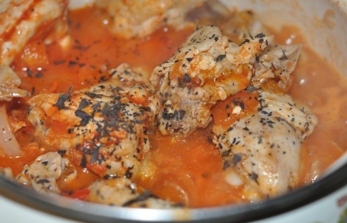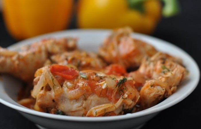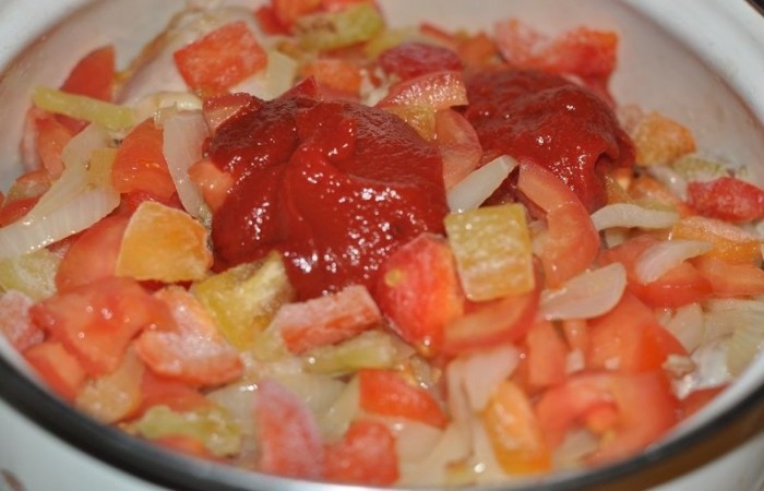6Лук перекладываем к курице и добавляем нарезанные кусочками перец с помидорами (без кожуры). Обжариваем несколько минут, а затем добавляем томатную пасту и тушим 15 минут на медленном огне.