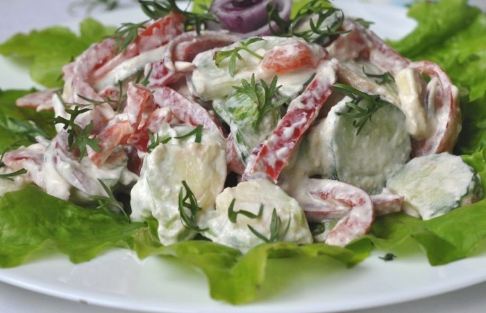Овощным салатом уже никого не удивишь, а вот в сочетании с авокадо он приобретает своеобразный нежный вкус и конечно же, питательную ценность. Оригинальную нотку придает салату пикантная заправка на основе сметаны, хрена, лимонного сока и молотого красного перца.