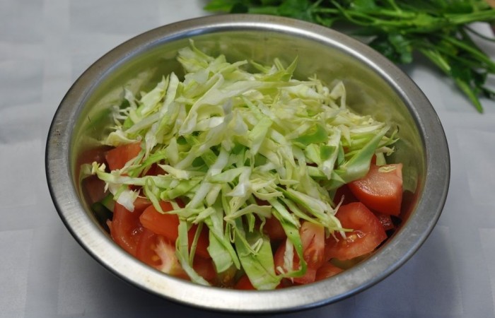 Как приготовить Салат с огурцами, помидорами и капустой - пошаговое описание