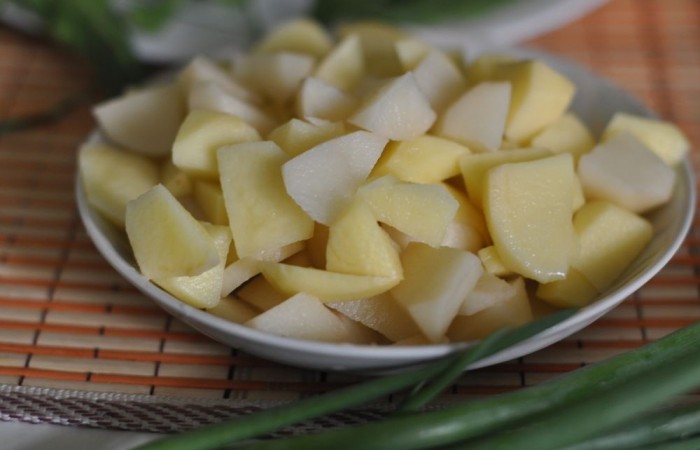 2Картофель нарезаем небольшими кубиками и выкладываем в кипящую воду. Варим 15 минут.