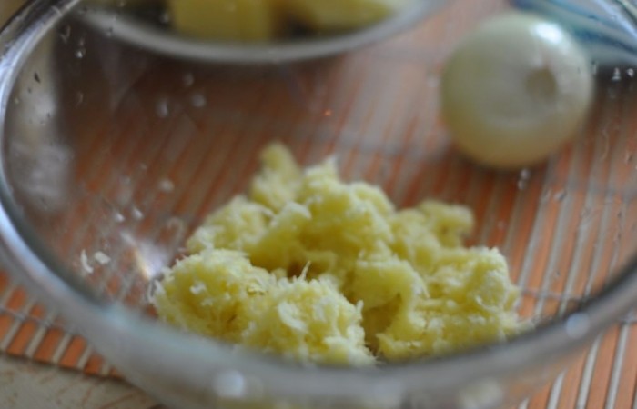 2Картофель с луком трем на мелкой терке (можно воспользоваться комбайном). Отжимаем лишнюю жидкость. Добавляем яйцо. Солим, перчим.