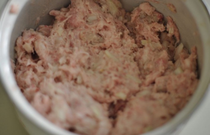 2Лук нарезаем мелкими кубиками и смешиваем его с фаршем.