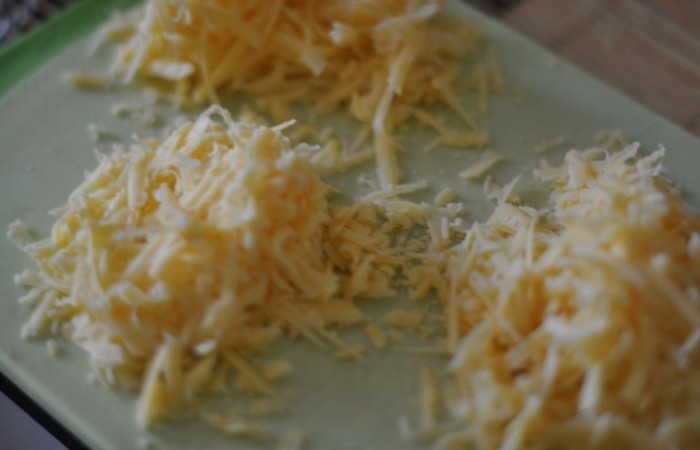 2Тем временем сыр трем на крупной терке и делим на 3 равные части.
