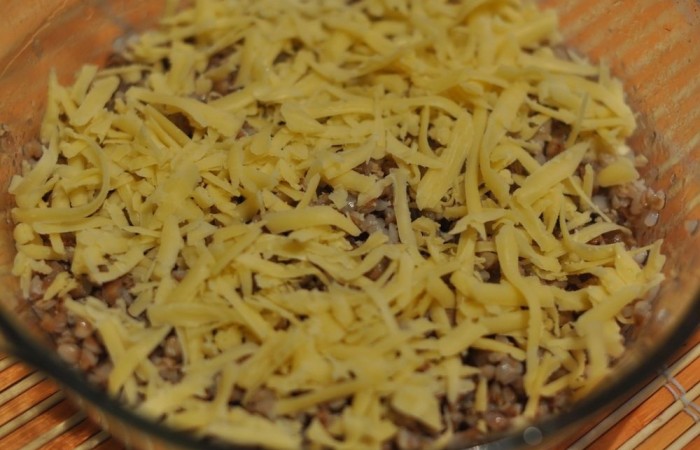 6Форму для запекания смазываем маслом и выкладываем половину гречки. Затем посыпаем одной из трех частей сыра.