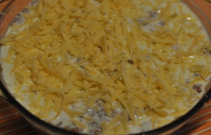 9Заливаем взбитыми яйца со щепоткой соли и добавляем сметану. Посыпаем третьей частью сыра и отправляем в духовку на 30 минут, предварительно разогретую до 180 градусов.