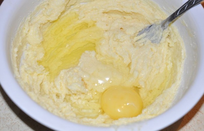 2Размягченное сливочное масло растираем с сахаром. Добавляем ванилин, яйцо и один белок (желток оставляем для смазывания печенья). Размешиваем до однородной консистенции.