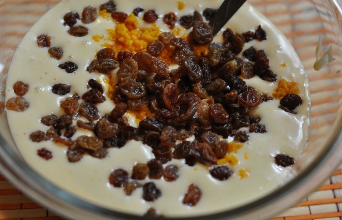 2С помощью миксера иди блендера взбиваем яйца с сахаром. Постепенно добавляем муку продолжая взбивать. Добавляем тертую цедру и запаренный изюм. Перемешиваем все.