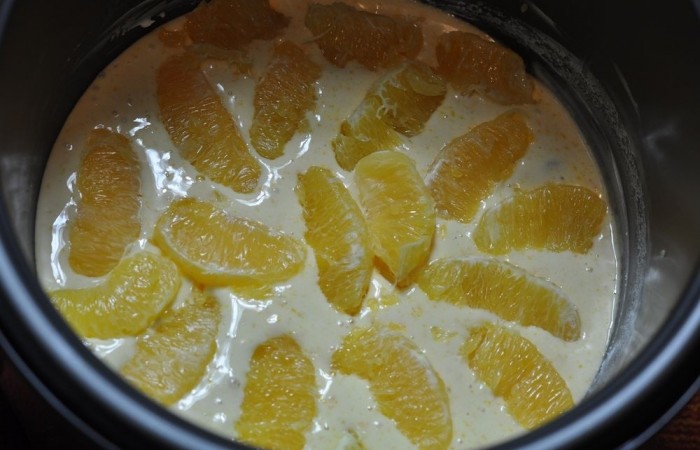 3Чашу мульиварки смазываем сливочным маслом и вливаем тесто. Выкладываем апельсиновые дольки и готовим в режиме "Выпечка" 1 час 10 минут.