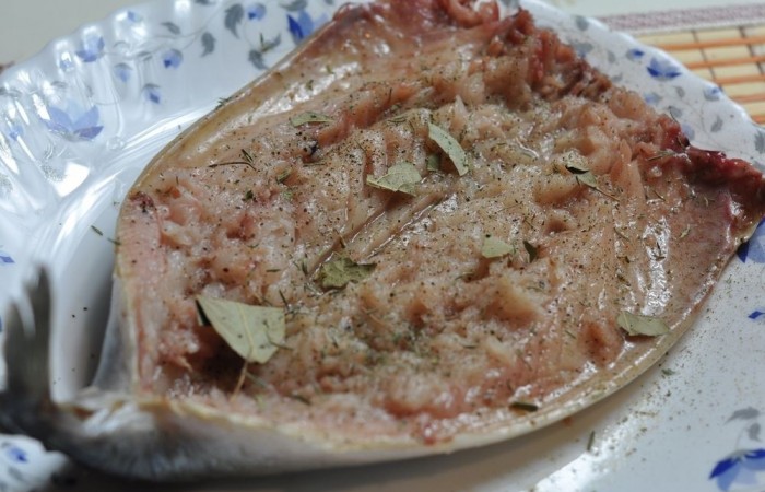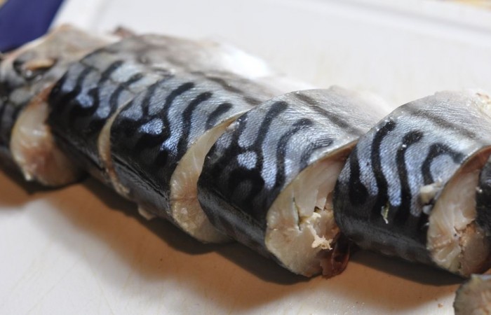 2Скумбрию разрезаем по брюшку и отрезаем голову с плавниками. Очищаем рыбу от внутренностей, удаляем кости и промываем. Филе рыбы просушиваем бумажным полотенцем. Выкладываем в емкость кожей вниз и посыпаем специями (лавровым листом, чабрецом и перцем).