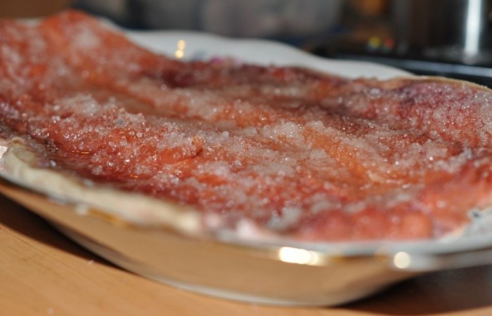 4Рыбу выкладываем на блюдо кожей вниз и посыпаем солью с сахаром. Оставляем при комнатной температуре на несколько часов. Затем переворачиваем рыбу кожей вверх, накрываем тарелкой и ставим в холодильник на 3-4 дня.