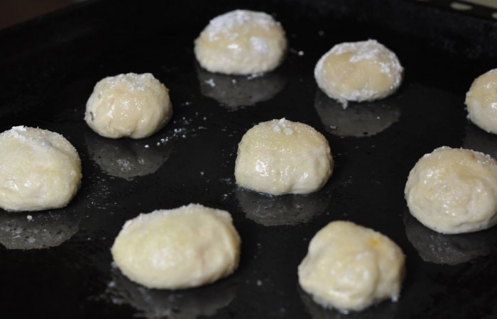 3Каждый кусочек скатываем в шарик и окунаем в растопленное сливочное масло (остуженное). Затем обмакиваем в смеси из сахара и муки. Выкладываем на смазанный маслом противень и оставляем в покое на 30 минут в теплом месте. Затем булочки можно отправлять в разогретую до 200 градусов духовку на 20-15 минут.