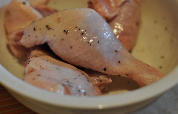 2Растительное масло смешиваем с солью, базиликом, тимьяном и перцем. Перемешиваем все и поливаем наши окорочка половиной маринада. Оставляем мариноваться.