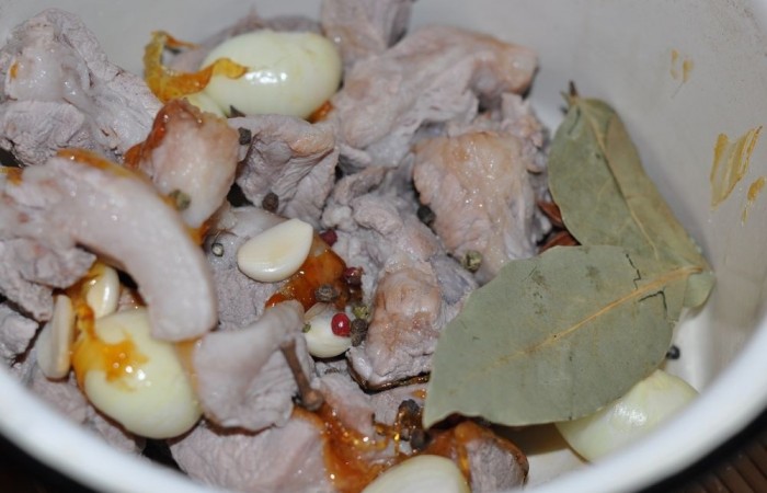 3К мясу добавляем очищенные зубчики чеснока и нарезанный крупными кусочками лук. Также добавляем перец, бадьян, лавровый лист, мед, тонко нарезанный имбирь и вливаем соевый соус.