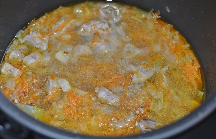 3Затем выкладываем тертую морковь и мелко нарезанный лук. Готовим в режиме "Жарка" 7 минут. Затем вливаем воду, солим, перчим и добавляем лавровый лист с перцем. Готовим в режиме "Плов" час.