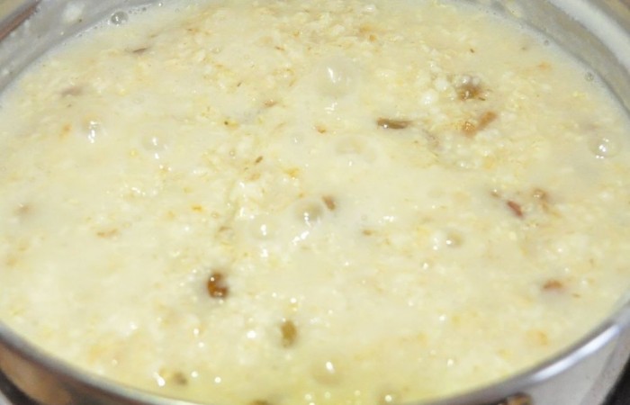 2В кипящую воду всыпаем овсяные хлопья. Варим 4 минуты на сильном огне. Затем уменьшаем огонь, всыпаем промытый изюм и варим еще 5-6 минут. Даем каше настояться несколько минут.