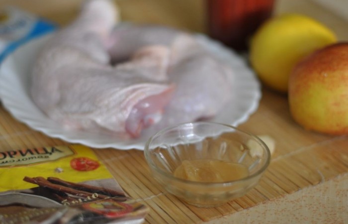 1Подготавливаем необходимые ингредиенты. Окорочка промываем, обсушиваем и сбрызгиваем лимонным соком.
