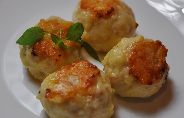 4Из куриной массы формируем небольшие шарики размером с грецкий орех. Выкладываем на противень, застеленный пергаментом, и отправляем в духовку на 20 минут, предварительно разогретую до 180 градусов.