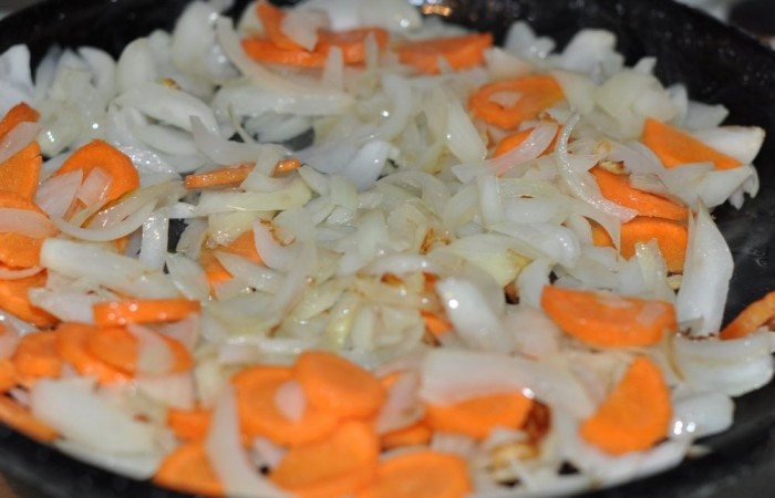 2Тем временем лук нарезаем соломкой и обжариваем на сковороде до прозрачности в течение 5-6 минут, периодически помешивая. Затем добавляем нарезанную кружочками морковь и жарим еще 5 минут.
