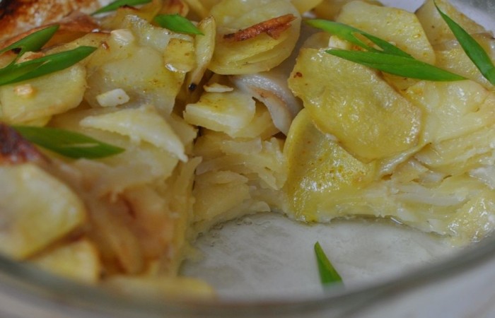 3Картофель порциями выкладываем на сковороду и слегка обжариваем. Солим в конце. Затем картофель выкладываем тонкими слоями в смазанную маслом форму, посыпая каждый слой специями и мелко нарезанным чесноком. Заливаем сливками и отправляем в духовку на 15 минут при 220 градусах, а затем снижаем температуру до 190 градусов и запекаем еще 45 минут.