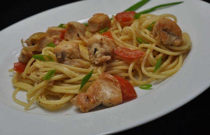 2Филе с помидором нарезаем небольшими кубиками, а лук полукольцами. Чеснок измельчаем. Филе солим, перчим и посыпаем специями. Спагетти отвариваем в подсоленной воде до готовности.