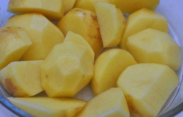 2Картофель тщательно очищаем, а большие клубни разрезаем пополам.