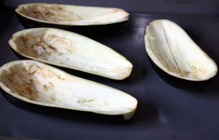 6Наполняем баклажаны начинкой и выкладываем в смазанную маслом или застеленную пергаментом форму. Накрываем фольгой и отправляем в духовку на 35-40 минут, предварительно разогретую до 180 градусов. За 10 минут до конца убираем фольгу.