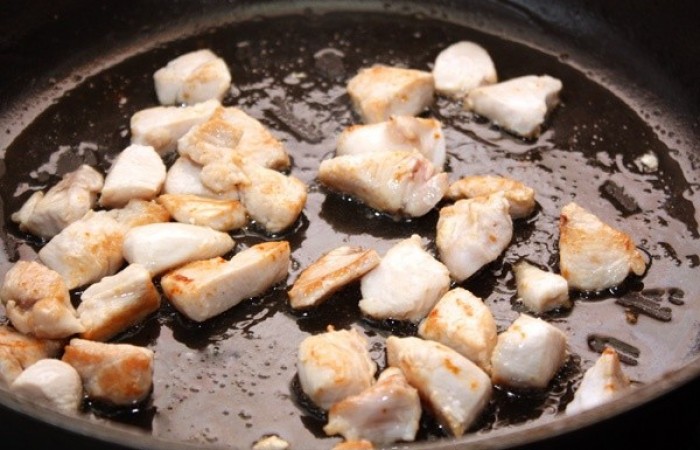 2Грудку нарезаем небольшими кубиками и обжариваем до золотистости. Солим, перчим.