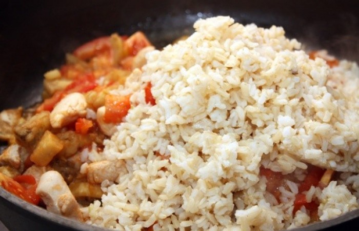 5Затем добавляем отварной рис. Тщательно все перемешиваем. Солим, перчим при необходимости и готовим все вместе 2-3 минуты.