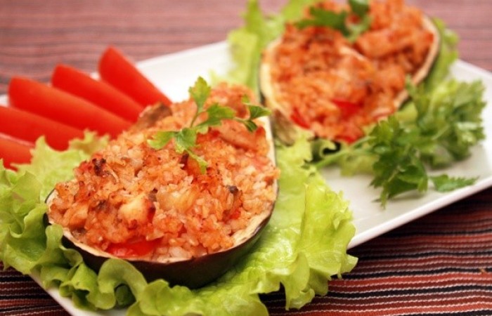 Фаршированные баклажаны, запеченные в духовке - яркая вкусная закуска, над которой можно всегда экспериментировать. Например, использовать больше овощей, посыпать тертым сыром перед запеканием или добавить грибы вместо курицы (можно использовать их вместе с курицей). Кроме того, закуска является порционной, что весьма удобно.