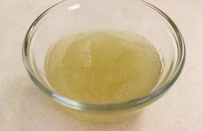 5Набухший желатин немного растапливаем в микроволной печи или на огне, но ни в коем случае не доводим до кипения.