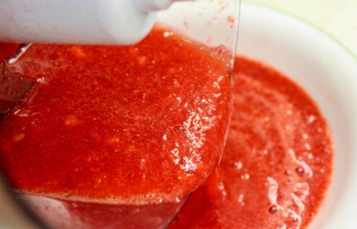 6Желатин добавляем к клубничному пюре и тщательно перемешиваем.