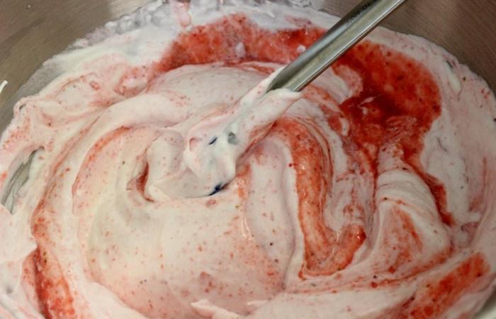 9Затем выкладываем готовый клубничный мусс и ставим в холодильник на 2 часа.