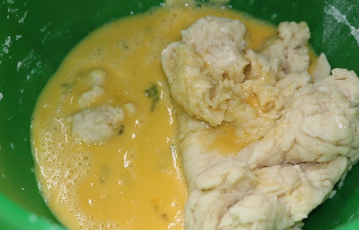 9Замешиваем гладкое однородное тесто. Оборачиваем пищевой пленкой и оставляем в покое на полчаса.