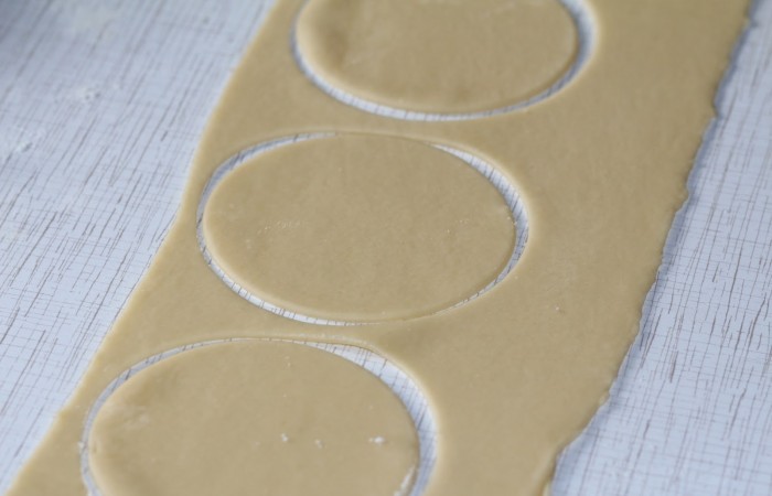 14Раскатываем каждую часть в тонкий пласт толщиной примерно 1,5-2 см. С помощью стакана вырезаем кружочки.