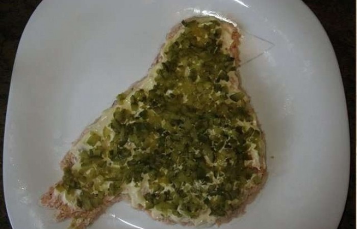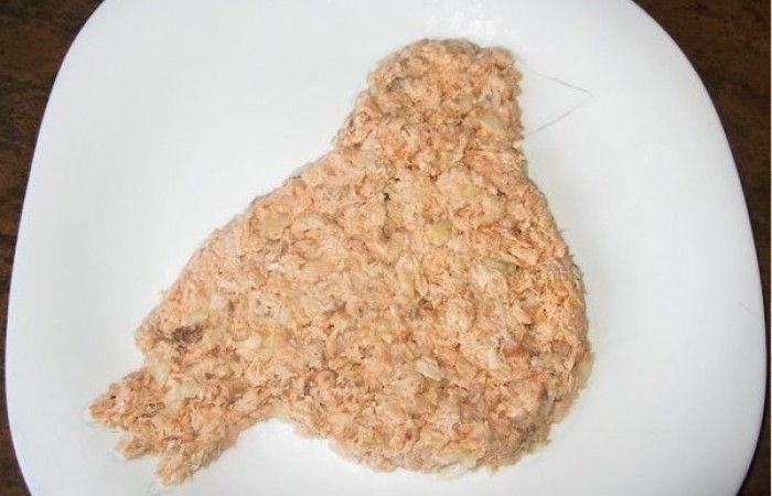 2Горбушку измельчаем с помощью вилки (при этом очищаем ее от костей и хребтов) и выкладываем первым слоем, оставляя нетронутым лишь клюв. Смазываем майонезом.
