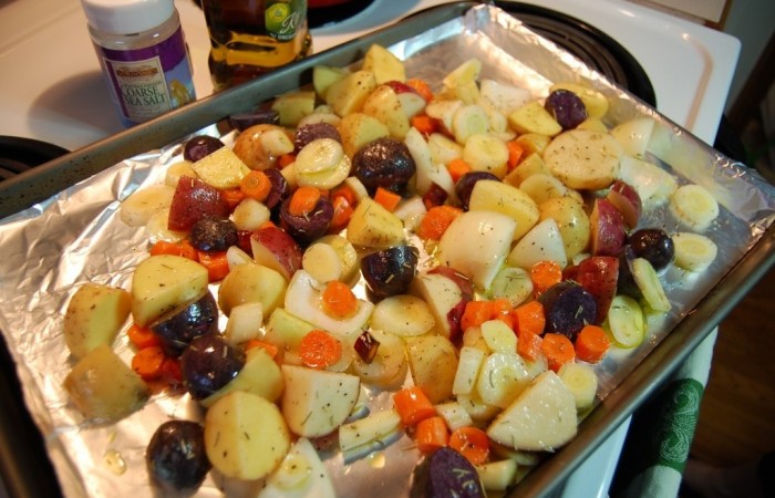 2Выкладываем овощи на противень, застеленный фольгой.