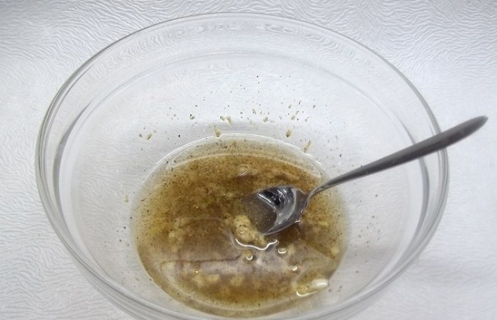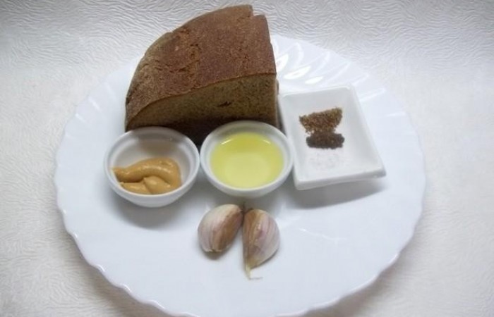 3В емкость кладем мелко нарезанный чеснок, горчицу, соль, перец и кориандр.