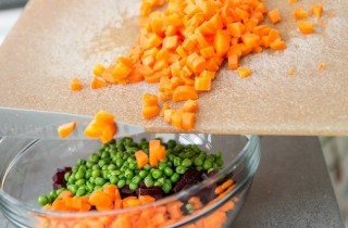 2В салатнице смешиваем свеклу, зеленый горошек и нарезанную мелкими кубиками морковь.
