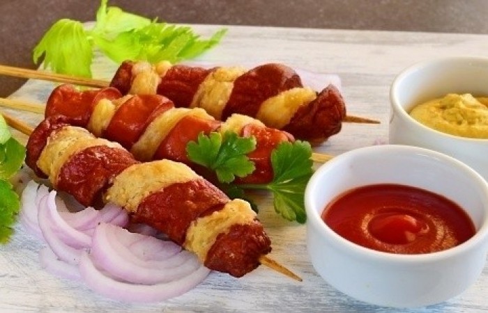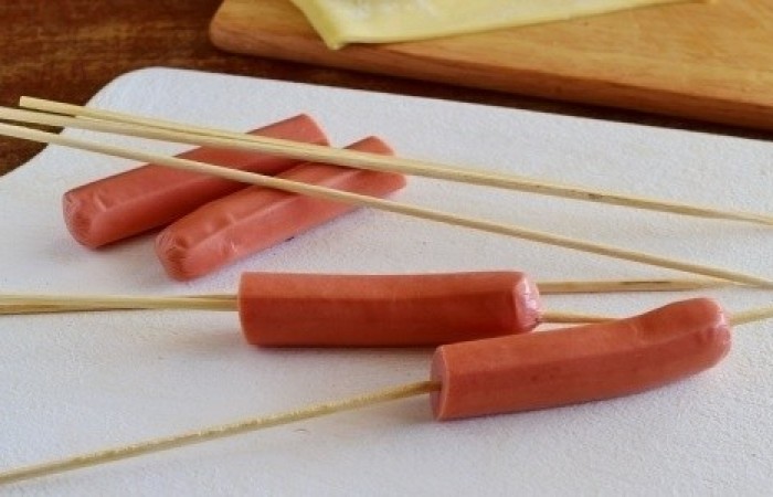 2Сосиски разрезаем пополам и вставляем в каждую шпажку.