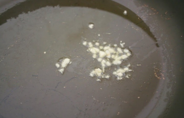 4Тем временем в отдельной сковороде обжариваем на оливковом масле мелко нарезанный чеснок.