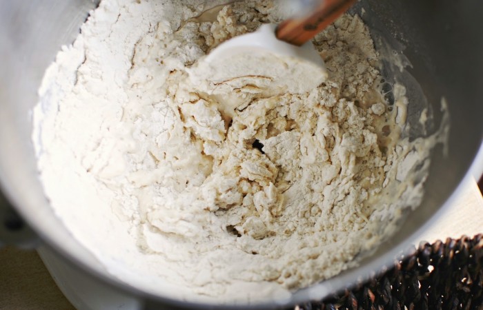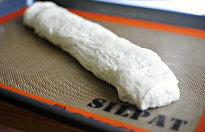 8Скатываем тесто в форме багета и кладем на застеленный ковриком или пергаментом противень.