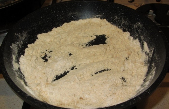 3Тем временем в отдельной сковороде обжариваем муку (без масла) до золотистости.