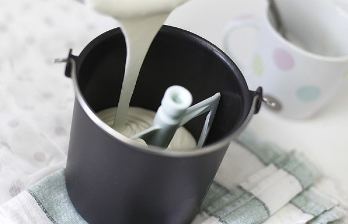 7Сливки смешиваем с молочной смесью и переливаем массу в мороженицу (если таковой не имеется, смесь нужно каждые 15 минут доставать из морозилки и взбивать миксером).